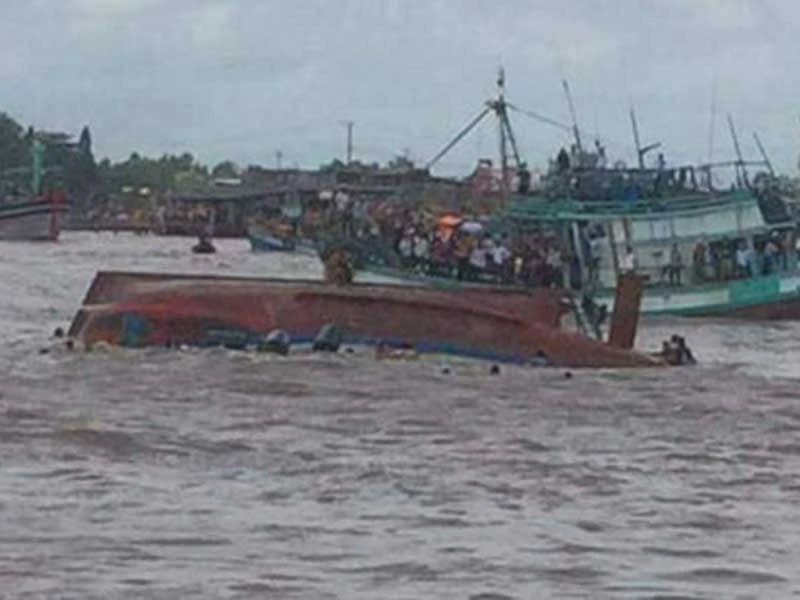 Con tàu đang chở hàng chục người tham gia lễ hội Nghinh Ông thì bị nạn. (Ảnh do bạn đọc cung cấp)