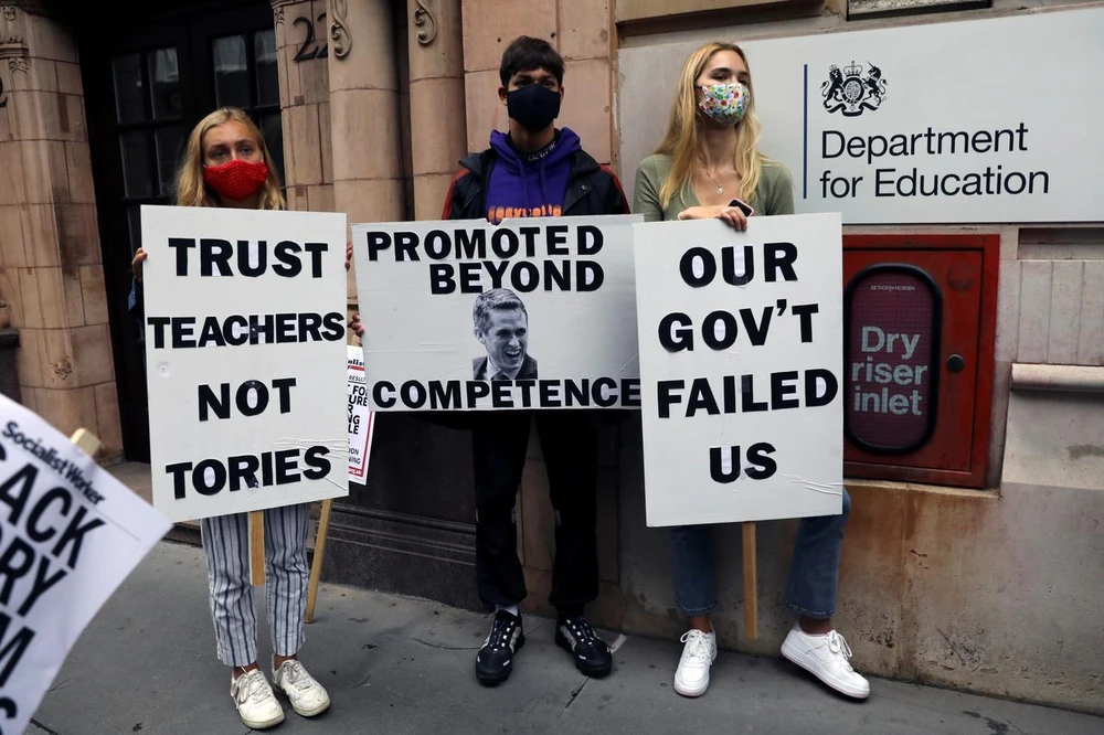 Kết quả là hàng trăm học sinh đã tụ tập trước trụ sở của Bộ Giáo dục Anh để phản đối cách tính điểm tốt nghiệp nói trên.