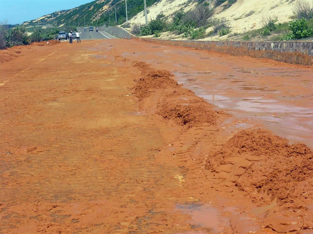 Do khai thác titan vô tội vạ làm vỡ hồ chứa tràn xuống lấp cả mặt đường.