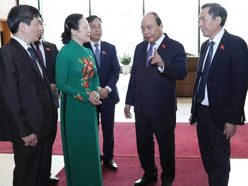 Thủ tướng Nguyễn Xuân Phúc trao đổi với các đại biểu Quốc hội. Ảnh: VGP