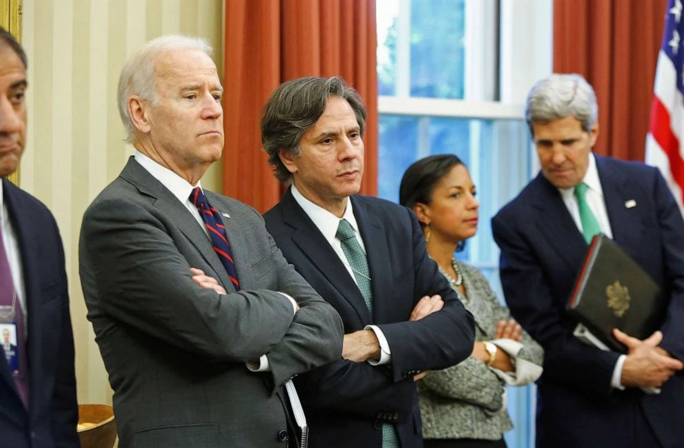 Tân Ngoại trưởng Mỹ Antony Blinken (giữa). Ảnh chụp tháng 11-2013: Từ trái qua: Phó Tổng thống Joe Biden, Phó Cố vấn an ninh quốc gia Antony Blinken, Cố vấn an ninh quốc gia Susan Rice, Ngoại trưởng John Kerry dự một buổi họp báo của Tổng thống Barack Obama tại Nhà Trắng. Ảnh: REUTERS