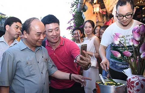 Thủ tướng Nguyễn Xuân Phúc đi bộ trò chuyện với du khách tại phố cổ Hội An chiều 8-8. Ảnh: QUANG HIẾU - VGP