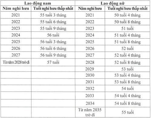Theo đó, từ ngày 1-1-2021, tuổi nghỉ hưu của người lao động trong điều kiện bình thường là đủ 60 tuổi 3 tháng đối với nam, và đủ 55 tuổi 4 tháng đối với lao động nữ. Sau đó, cứ mỗi năm tăng thêm 3 tháng đối với nam cho đến khi đủ 62 tuổi vào năm 2028 và cứ mỗi năm tăng thêm 4 tháng đối với nữ cho đến khi đủ 60 tuổi vào năm 2035.