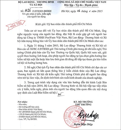 Trước đó, sáng 1-4 Bộ LĐ-TB&XH đã có công văn khẩn liên quan đến vấn đề này do Thứ trưởng Doãn Mậu Diệp ký, chúng tôi xin đăng nguyên văn như sau: