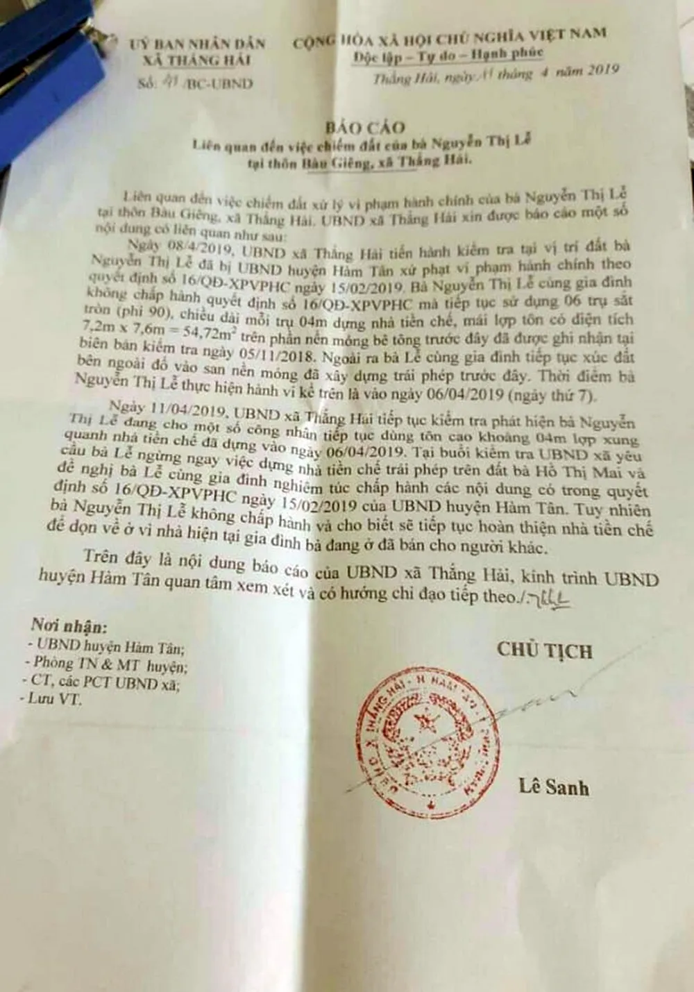Văn bản báo cáo của UBND xã cho biết bà Lễ sẽ dọn vào nhà dựng trái phép để ở.