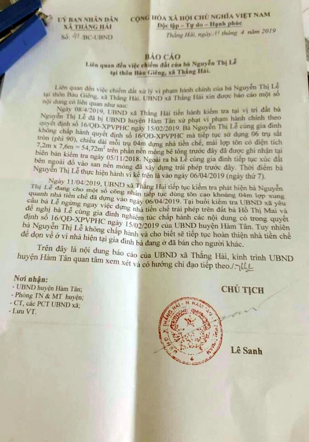 Ngày 26-4, tin từ UBND huyện Hàm Tân (Bình Thuận) cho biết, liên quan đến việc xây móng, dựng nhà trên đất hàng xóm, ông Lê Sanh, Chủ tịch UBND xã Thắng Hải đã tiếp tục có văn bản báo cáo cho huyện việc này.