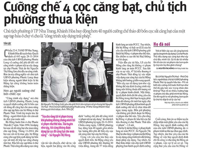 Một chủ tịch phường ở TP Nha Trang, Khánh Hòa huy động hơn 40 người cưỡng chế tháo dỡ bốn cọc sắt căng bạt của một sạp tạp hóa ở chợ vì cho là “công trình xây dựng trái phép”. “Công trình xây dựng” này là bốn cọc sắt dùng để căng bạt che mưa nắng cho sạp tạp hóa của bà Nguyễn Thị Hồng ở chợ Phước Thái. Bà Hồng khởi kiện, tòa đã hủy các quyết định cưỡng chế này vì vi phạm trình tự thủ tục theo quy định…