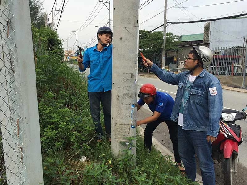 Thanh niên và cán bộ phường Tam Phú đang đi tháo những tờ rơi quảng cáo dán trên trụ điện, tường nhà... Ảnh: TL