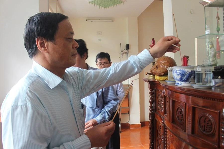 Ông Võ Ngọc Đồng, Chủ tịch UBND huyện Hoàng Sa, TP Đà Nẵng, thắp hương tri ân trước bàn thờ nhân chứng Ngô Tấn Phát. Ảnh: TÂM AN
