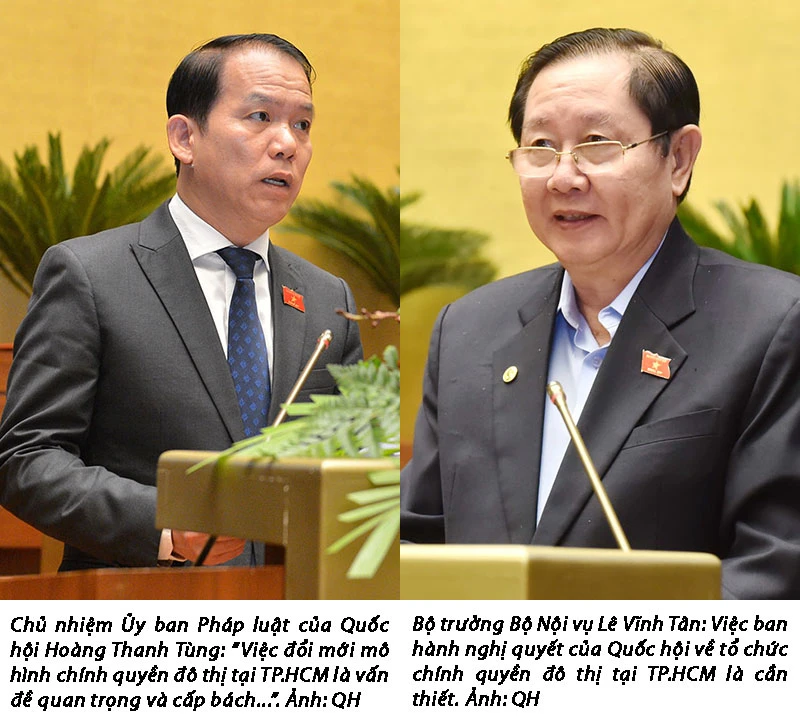Báo cáo thẩm tra sau đó, Chủ nhiệm Ủy ban Pháp luật của Quốc hội Hoàng Thanh Tùng trình bày có hai loại ý kiến về việc thí điểm hay tổ chức luôn chính quyền đô thị tại TP.HCM. Một trong những cơ sở để tán thành thực hiện ngay mà không cần thí điểm là TP.HCM đã thực hiện thí điểm không tổ chức HĐND huyện/quận, phường. Kết quả thí điểm cho thấy việc không tổ chức HĐND ở quận, phường là phù hợp với mô hình chính quyền đô thị, được Đảng bộ, chính quyền và nhân dân TP ủng hộ.