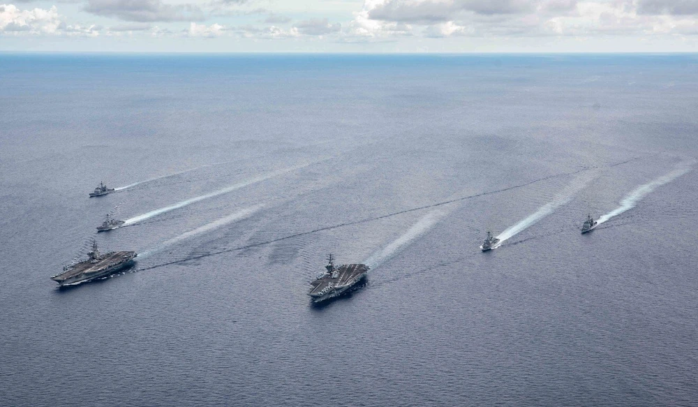 Nhóm tác chiến tàu sân bay USS Ronald Reagan và USS Nimitz tại Biển Đông hồi tháng 7. Ảnh: EPA