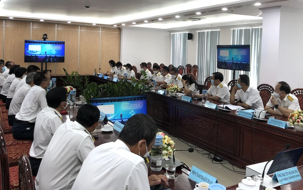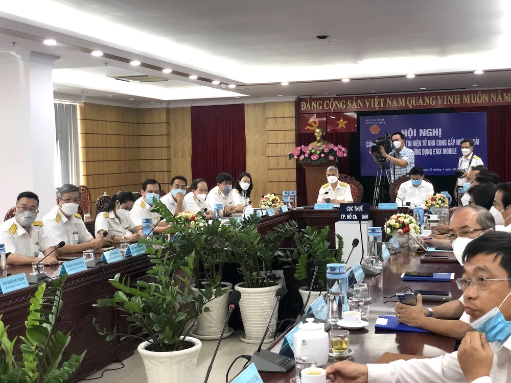 Đầu cầu trực tuyến hội nghị công bố Cổng Thông tin điện tử dành cho nhà cung cấp nước ngoài tại Cục Thuế TP.HCM sáng 21-3. (Ảnh: QH)