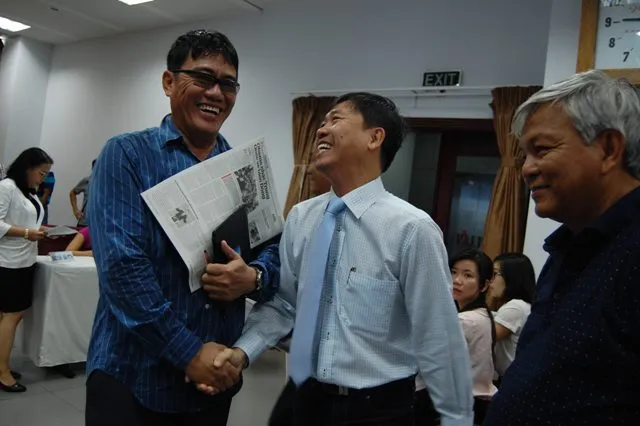 Ông Dương Vũ Lâm, trưởng đại diện văn phòng VFF phía nam, phó chủ tịch LĐBĐ Đông Nam Á cùng nhà báo Nguyễn Nguyên, thư ký tòa soạn báo Pháp luật TP. HCM trước buổi lễ. ẢNH: HUYỀN VI