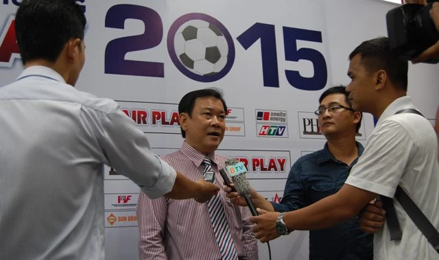 Ông Mai Ngọc Phước, Quyền Tổng biên tập báo Pháp luật TP. HCM, Trưởng BTC giải Fair Play 2015 trả lời phỏng vấn báo đài trước giờ công bố giải. ẢNH: HUYỀN VI
