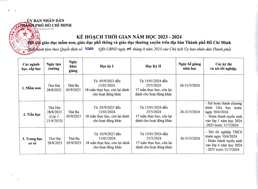 UBND TP.HCM vừa ban hành kế hoạch thời gian năm học 2023-2024 đối với bậc giáo dục mầm non, giáo dục phổ thông và giáo dục thường xuyên.