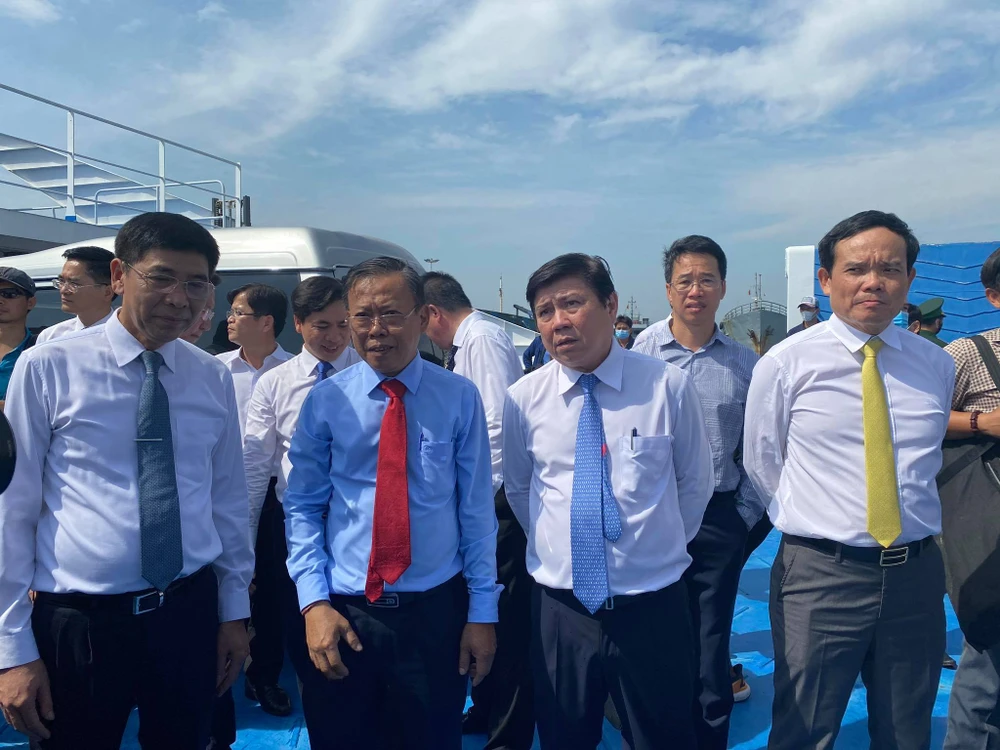 Phó Bí thư thường trực Thành ủy TP.HCM Trần Lưu Quang, Chủ tịch UBND TP.HCM Nguyễn Thành Phong và các lãnh đạo TP tại lễ khai trương tuyến phà biển Cần Giờ - Vũng Tàu.