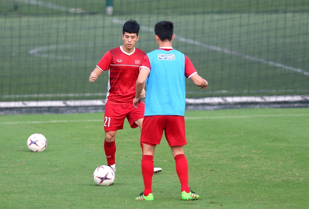 Trung vệ Đình Trọng (bìa trái) vẫn tập chung với đồng đội nhưng chưa thể ra sân ở hai trận ra quân của U-23 Việt Nam tại giải châu Á. Ảnh: AN