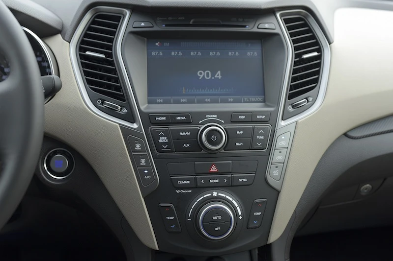 Bên trong ca-bin, SantaFe 2016 cung cấp cho khách hàng tùy chọn 2 màu nội thất bao gồm màu xám và màu be thay vì một màu nội thất như thế hệ tiền nhiệm. Bên cạnh đó còn có những tính năng tiện ích cao cấp, bao gồm hệ thống âm thanh 6 loa, màn hình DVD 8 inch tích hợp camera lùi và bản đồ dẫn đường chính hãng được phát triển dành riêng cho thị trường Việt Nam, máy lạnh riêng cho hàng ghế thứ 3, chìa khóa thông minh cùng khởi động nút bấm Start/Stop Engine, cửa sổ trời panorama. Ngoài ra, SantaFe 2016 còn được trang bị cốp xe chỉnh điện giúp tăng tính tiện dụng cho xe.