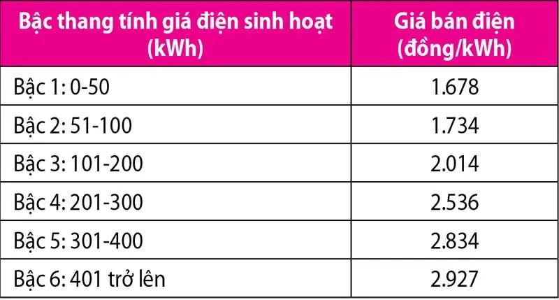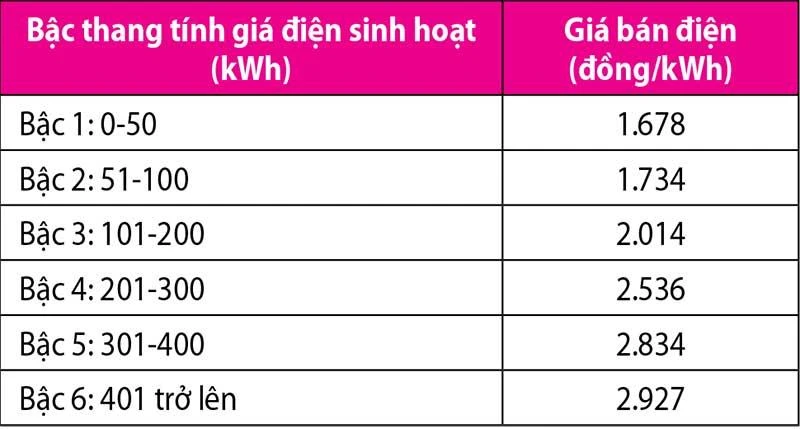 Đồng thời, Bộ Công Thương cũng ban hành bảng giá bán điện cho các nhóm khách hàng. Trong đó, giá bán lẻ điện sinh hoạt được chia làm sáu bậc, theo cách tính lũy tiến, bậc cao nhất có giá 2.927 đồng/kWh, thấp nhất 1.678 đồng/kWh. Giá bán lẻ điện sinh hoạt dùng cho công tơ thẻ trả trước là 2.461 đồng/kWh.