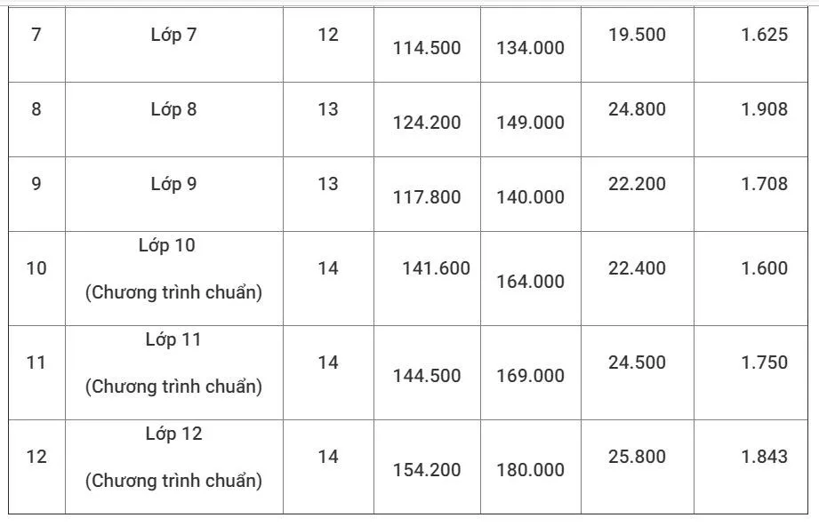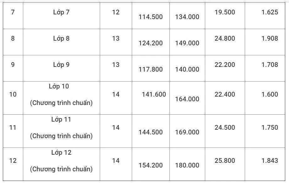 Bảng giá sách các lớp được điều chỉnh như sau: