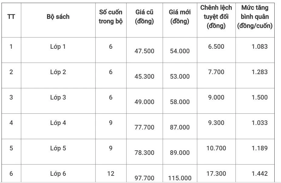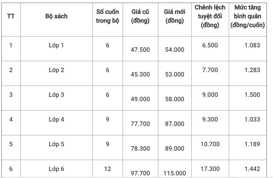 Theo giá mới này, mức chênh lệch so với giá cũ của mỗi bộ SGK là 6.500-25.800 đồng, tùy theo lớp.