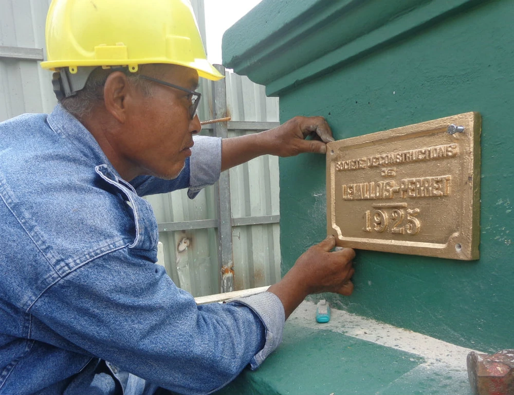 Bảng đề năm 1925 xây dựng cầu được gắn lại ở chuôi hai cây kiếm ở hai đầu cầu.