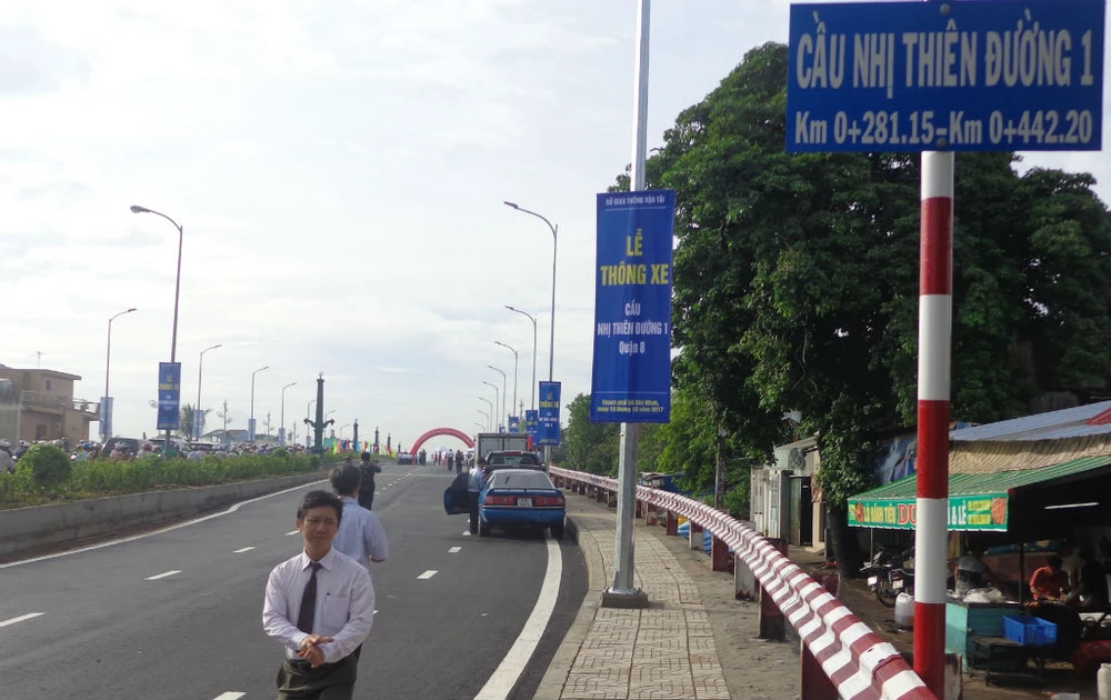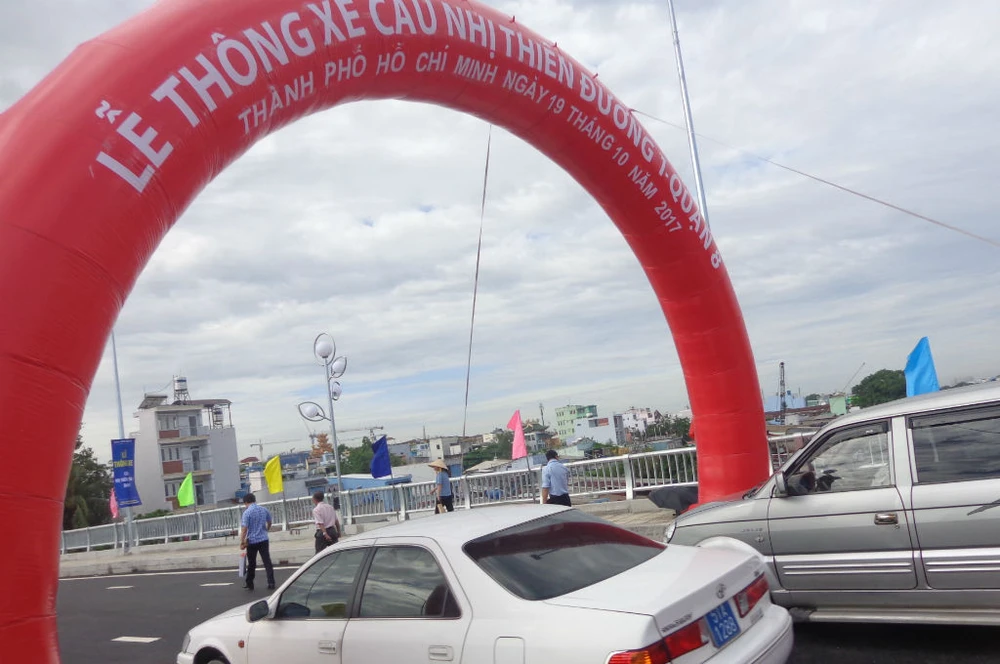 Đúng 8 giờ 30 sáng 19-10, cầu Nhị Thiên Đường 1 mới được thông cho những chiếc xe đầu tiên đi qua.