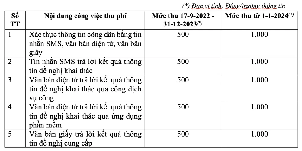 Mức phí xác thực và khai thác thông tin công dân được quy định như sau: