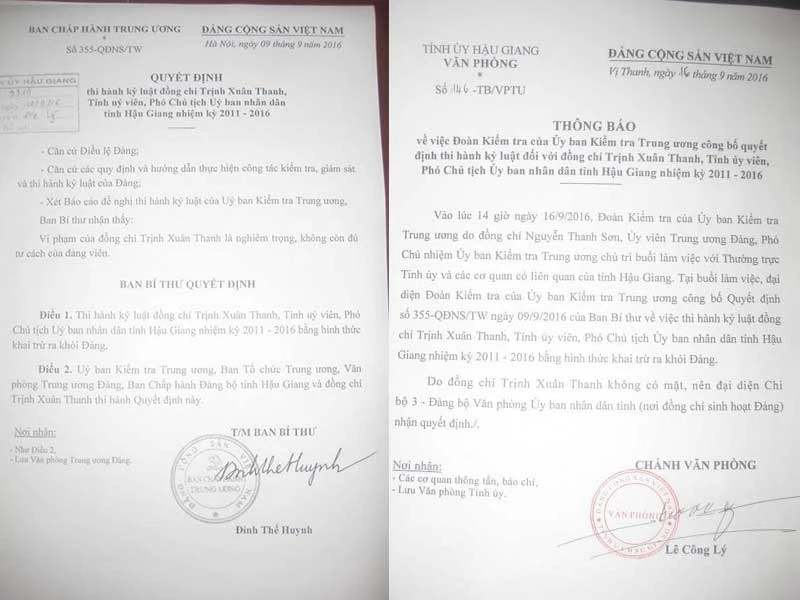 Kết quả 100% ủy viên Ban Bí thư Trung ương Đảng đã bỏ phiếu thống nhất quyết định kỷ luật với hình thức khai trừ Đảng với tỉnh ủy viên Hậu Giang Trịnh Xuân Thanh.