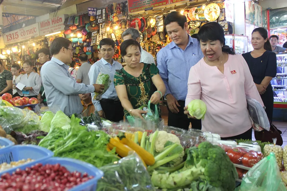 Đoàn kiểm tra quầy bán rau củ quả tại chợ Bến Thành
