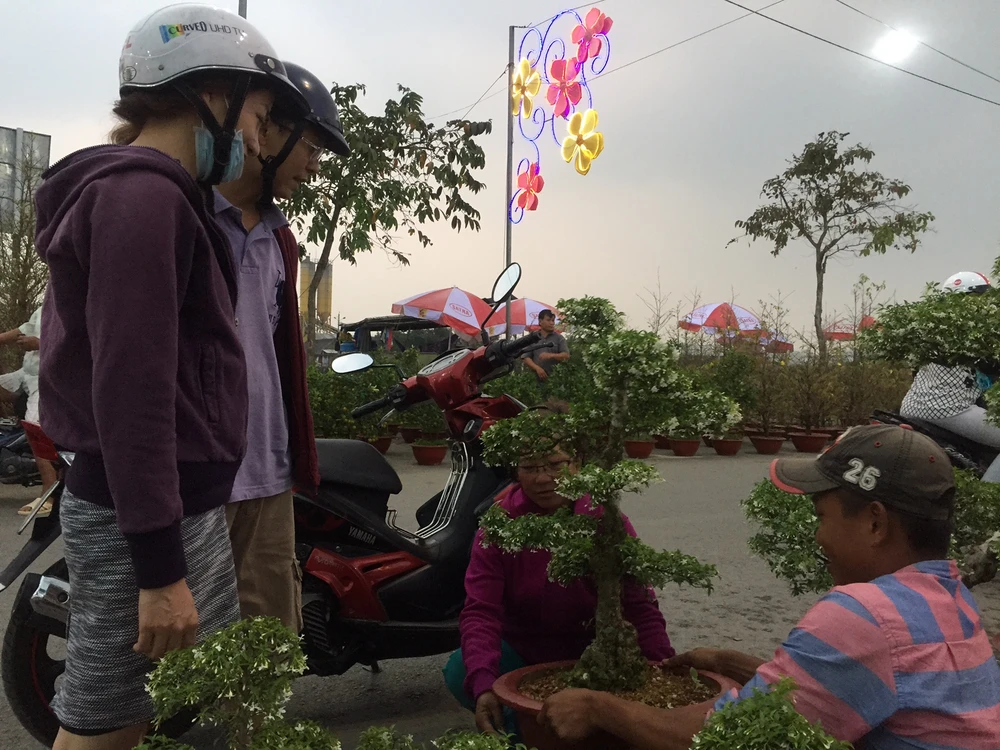 Chị Trần Thanh Bình ở gần chợ Bình Điền cũng nhanh tay chọn ngay một chậu mai chiếu thủy. Sau khi được bà chủ giới thiệu nên chọn chậu mai chiếu thủy có dáng vừa không quá cao cũng không quá thấp thì chị chọn mua. Theo chị Bình lần đầu đi mua mà thấy giá 500.000 đồng/chậu nên cũng không biết đắt giá hay rẻ nhưng tết thì mua về chưng.