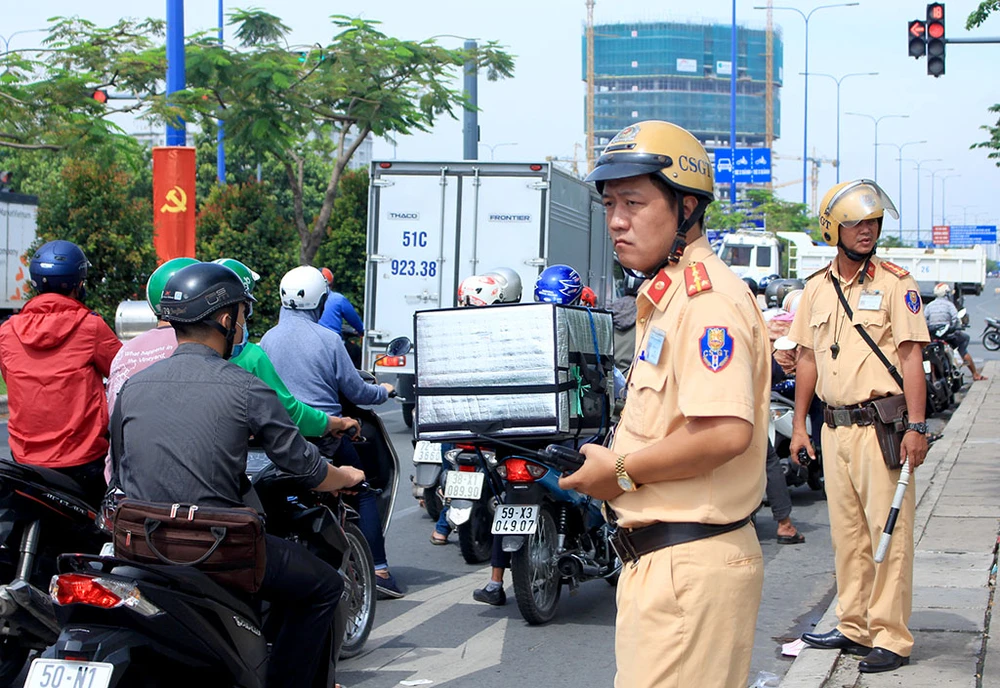 Đội CSGT Cát Lái xử lý vi phạm tốc độ trên đường Mai Chí Thọ, quận 2, TP.HCM, sáng 11-5. Ảnh: PHƯỢNG