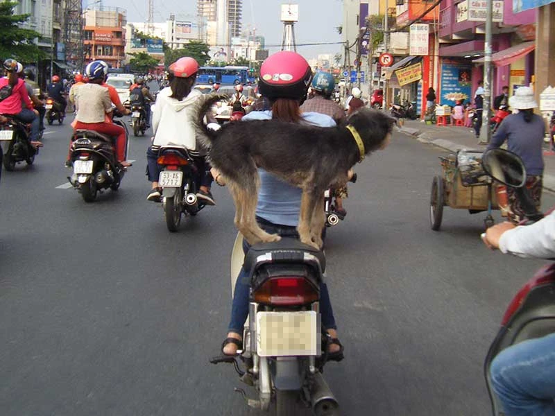 Cách chở chó như thế này không an toàn vì nếu con chó bất ngờ nhảy xuống đường sẽ gây nguy hiểm cho người lưu thông phía sau vì không tránh kịp.