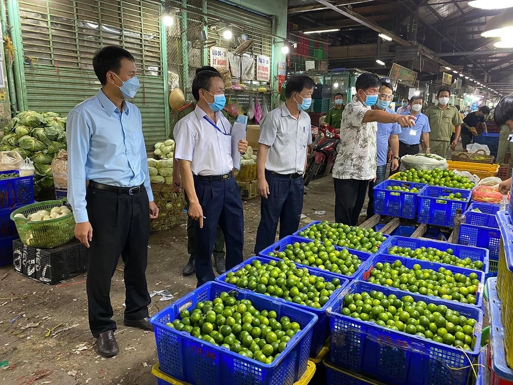Đoàn công tác do Phó Chủ tịch UBND TP Thủ Đức Nguyễn Bạch Hoàng Phụng dẫn đầu đi kiểm tra tại chợ đầu mối nông sản Thủ Đức. ẢNH: T.T