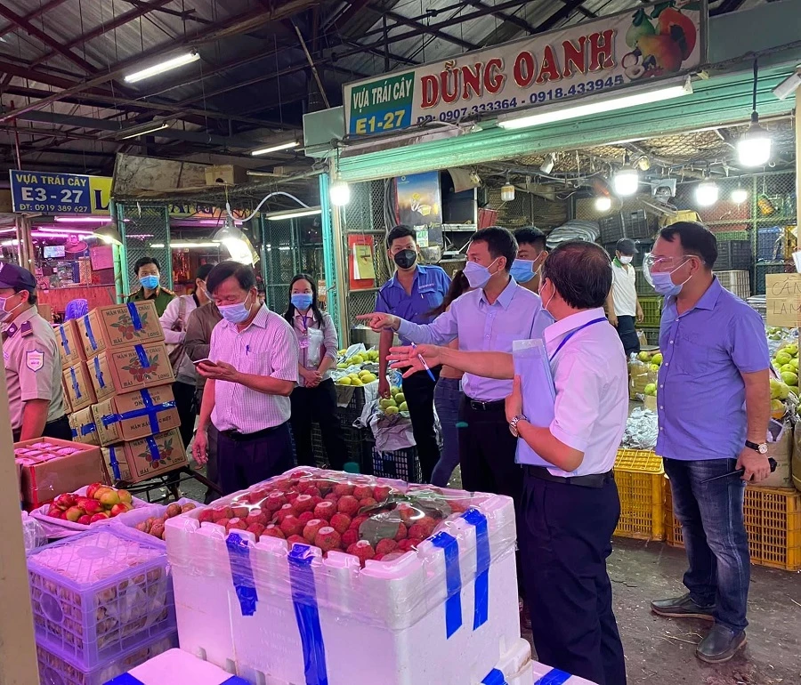Tối 18-6, Phó Chủ tịch UBND TP Thủ Đức Nguyễn Bạch Hoàng Phụng cùng đoàn công tác phòng, chống dịch COVID-19 của TP Thủ Đức đã kiểm tra đột xuất công tác chống dịch tại chợ đầu mối nông sản Thủ Đức.