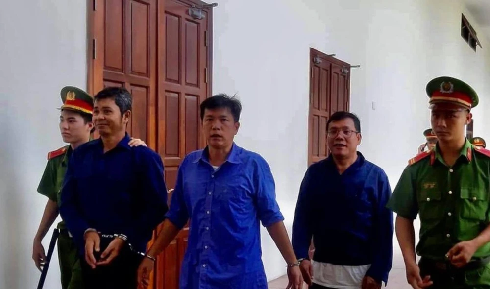 Bị cáo Nguyễn Cảnh Chân (giữa) cựu CSGT duy nhất phải ra tòa trong vụ án loho xe vua, được cấp phúc thẩm triệu tập đến tòa để làm rõ việc đưa, nhận và môi giới hối lộ dù không kháng cáo. Ảnh: HY