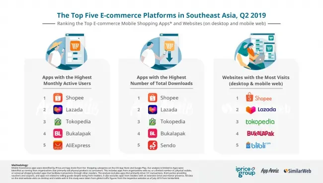 Cụ thể, theo số liệu thống kê của iPrice, tại quý II-2019, ứng dụng có lượt mua sắm trên thiết bị di động, máy tính và lượt tải về cao nhất tại sáu nước Đông Nam Á thuộc về Shopee. Vị trí thứ hai thuộc về Lazada, và vị trí 3-4 lần lượt được hai ứng dụng nội địa từ Indonesia nắm giữ - Tokepedia, Bukalapak.
