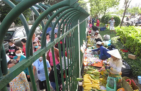 Dọc theo hàng rào sắt dài gần 1 km, cao 2 m hàng hóa được bày bán la liệt từ thực phẩm: xôi, rau, bắp, thịt, cá, khô, trái cây... đến nhu yếu phẩm: giày dép, áo quần, xà bông giặt… Không khí buôn bán xôm tụ không thua bất cứ một phiên chợ nào. Các tiểu thương chia sẻ, chợ bày bán nhốn nháo như vậy nhưng ai có chỗ nấy, không thể dọn ra trước là tranh chỗ đẹp mà mỗi chỗ đều có chủ hết. Họ đa số là dân nhập cư, trước cũng là công nhân chọn chỗ này mưu sinh, chấp nhận bán giá “bèo” nhưng bù lại họ không mất tiền thuê mặt bằng.