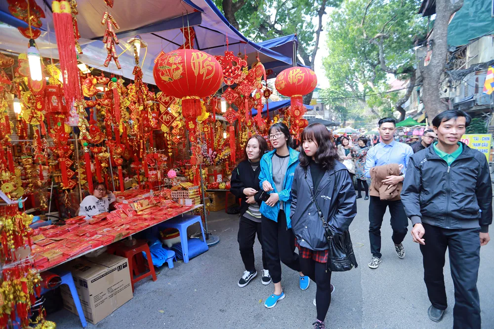 Trên các tuyến phố Hàng Lược, Hàng Mã, Lương Văn Can, không chỉ hoa mà còn có rất nhiều đồ trang trí khác phục vụ nhu cầu sắm Tết của người dân.