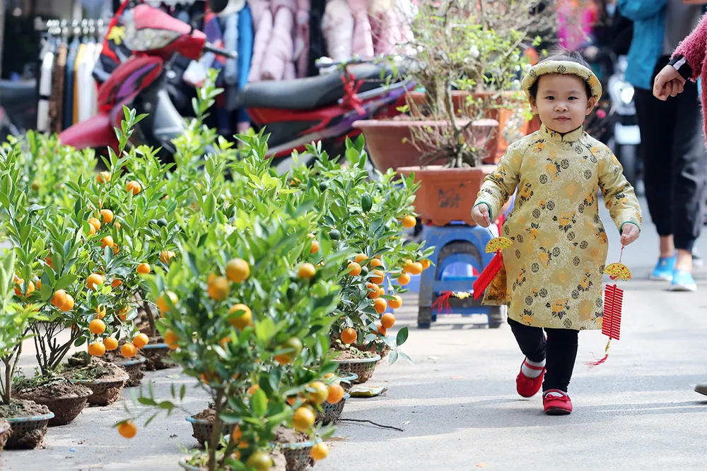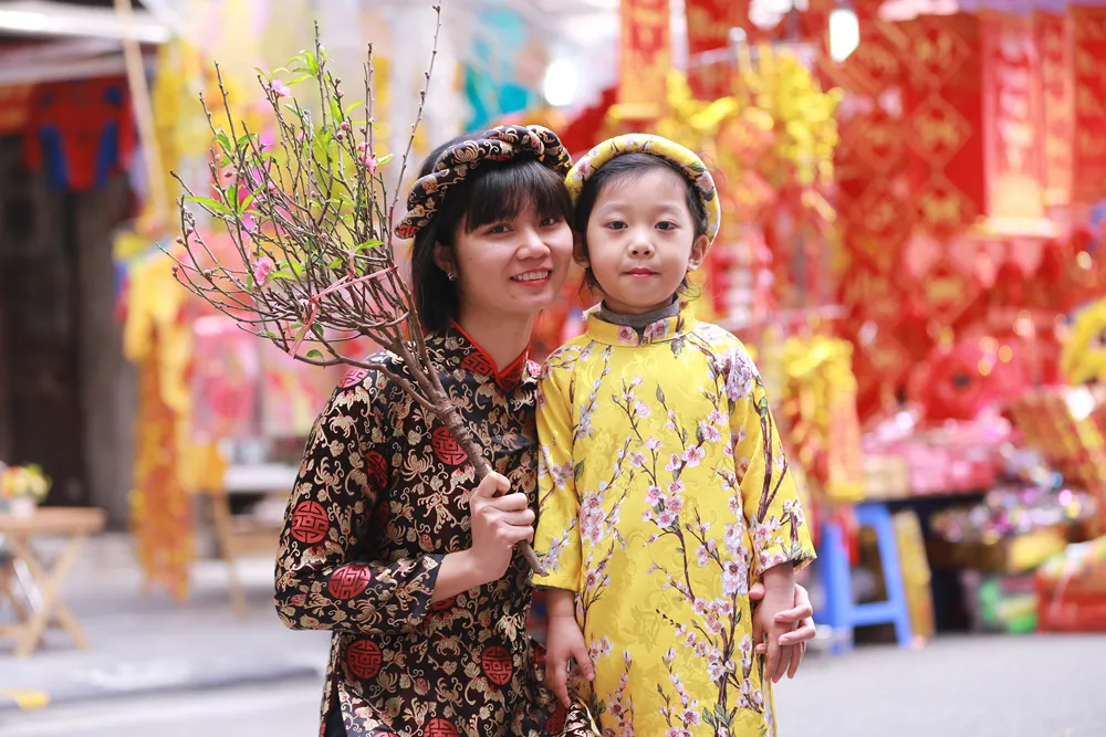 Người lớn, trẻ nhỏ mặc áo dài xuống phố du xuân.