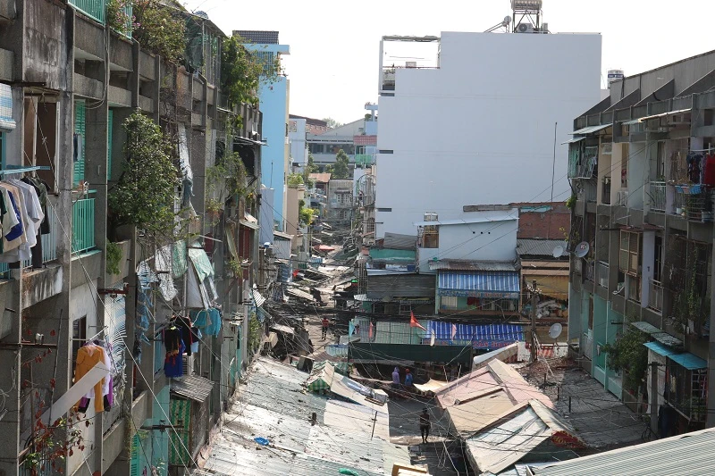 Từ khu chung cư Lê Hồng Phong cũ nhìn xuống chợ chỉ thấy toàn là mái che lụp xụp. Đó lại là niềm vui cuối ngày của nhiều người sống ở chung cư này.