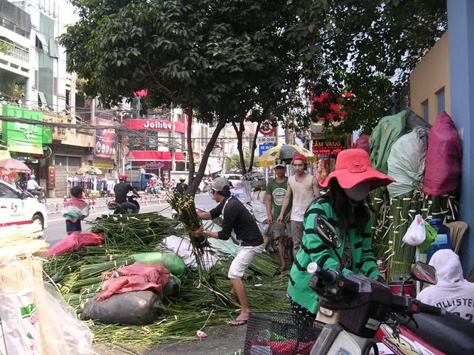 Nhiều người dân Sài Gòn dừng xe bên lề đường để mua lá dong. Đường Cách Mạng Tháng Tám trở nên nhộn nhịp, náo nhiệt hơn hẳn ngày thường. Chị Mỹ Thanh (giáo viên) chia sẻ: “Năm nào cũng vậy, cứ đến trưa ngày 23 là tôi lại ra đây mua lá dong về gói bánh tét. Nhờ có những gánh hàng lá này mà tôi cũng như những gia đình khác ở Sài Gòn có thể tìm lại và giữ gìn dư vị ngày Tết cổ truyền”.