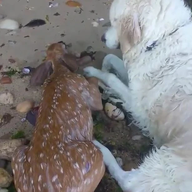 Trong khi Mark đang tính chụp lại khoảnh khắc đó thì chú chó Storm nhanh như cắt lao ra nhằm cứu lấy con nai bé nhỏ. Nó ngoạm nhẹ lấy cổ con vật đuối nước rồi cố kéo nó vào bờ. Mark động viên: “Giỏi lắm chàng trai, mang nó vào”