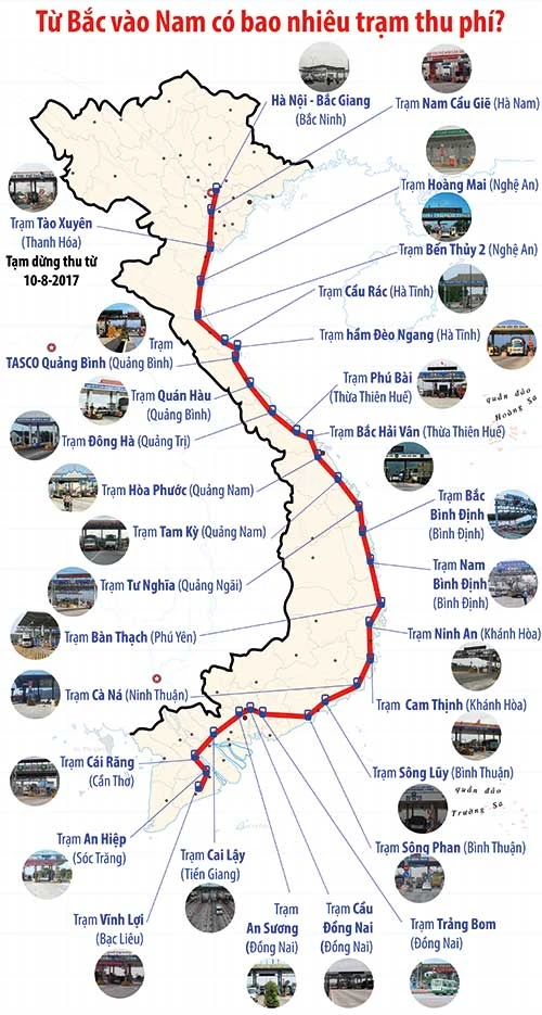 30 trạm thu phí BOT trên quốc lộ 1. Đồ họa: HỒ TRANG