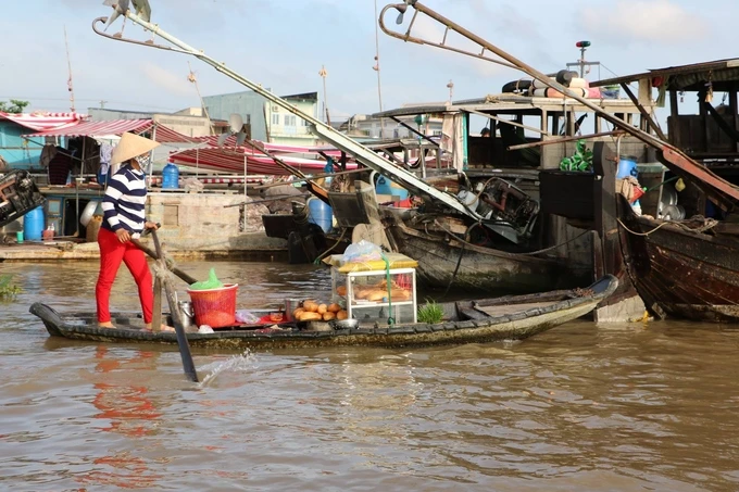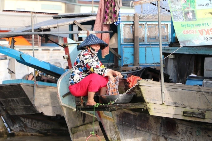 Nhiều ghe nhỏ neo đậu bên cạnh những ghe lớn (đồng thời là nhà), để tiện buôn bán trao đổi hàng. Xa xa là những ngôi nhà sàn đặc trưng của miền tây sông nước, được chống đỡ bằng gỗ hoặc xi măng độ bền tối thiểu 5 năm.
