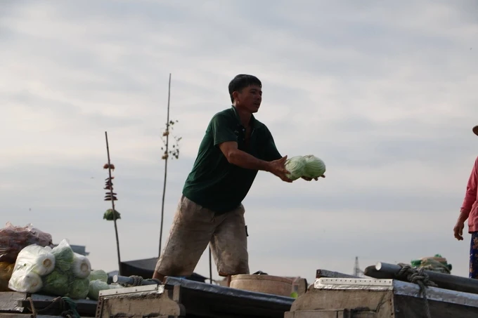 Bắp cải là món hàng mà người đàn ông này nhận về từ ghe khác để bán. Bắt chụp là thao tác thường thấy được ai nấy ở đây thực hiện thuần thục.