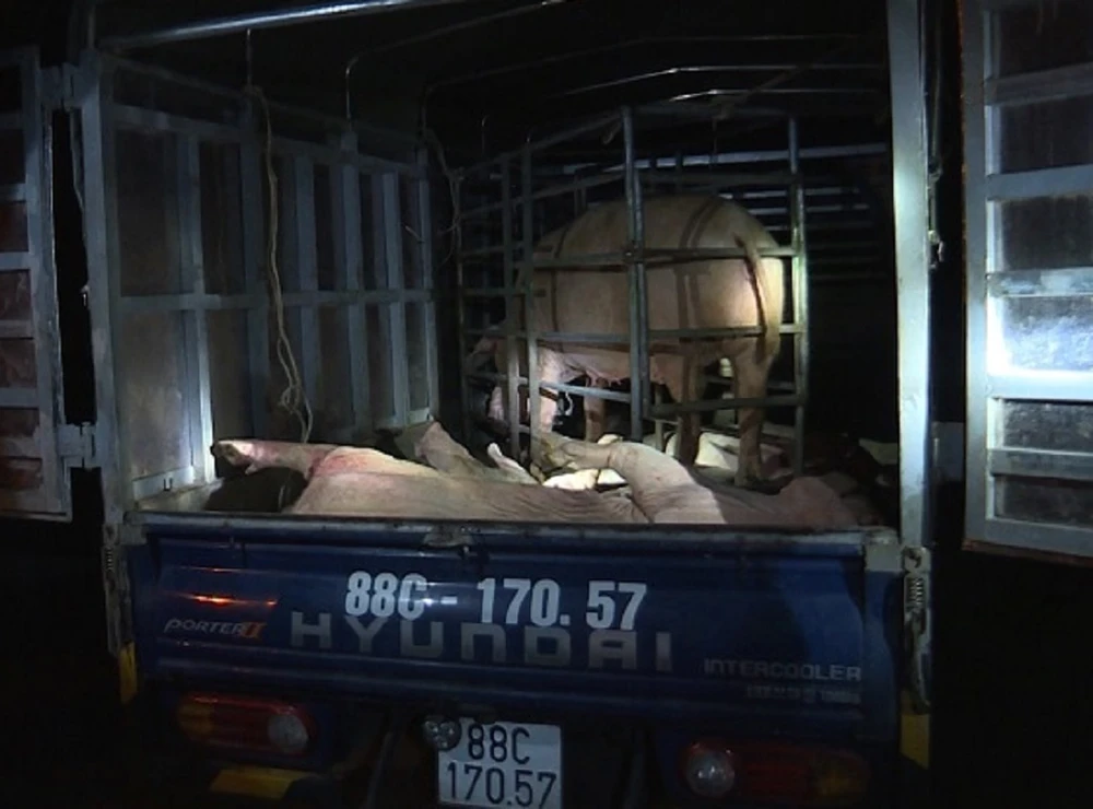 Cách đây ba ngày, ông NQH (34 tuổi, trú TP Vĩnh Yên) điều khiển xe tải chở theo sáu con heo. Trong số đó, hai con còn sống nhưng biểu hiện mắc bệnh truyền nhiễm, bốn con còn lại đã được mổ nội tạng, có nhiều nốt sần đỏ và đang bốc mùi hôi thối. Tổng trọng lượng số heo là hơn 500 kg.