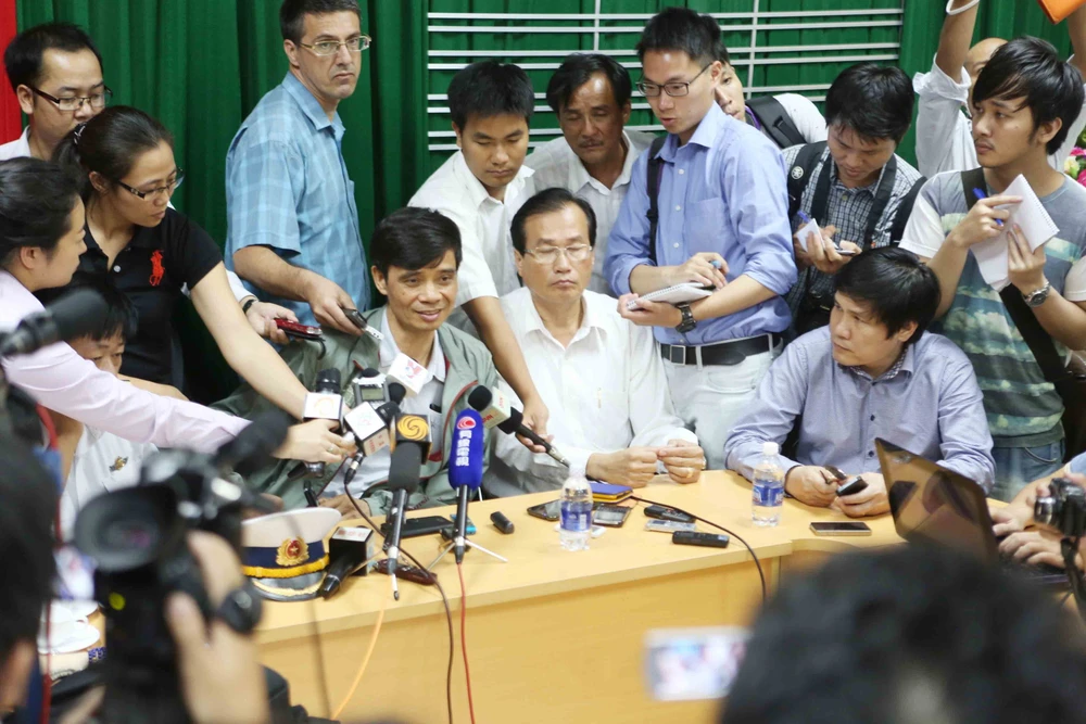 Thứ trưởng Bộ GTVT Phạm Quý Tiêu trong vòng vây của các phóng viên báo đài trong và ngoài nước tại cuộc họp báo tối 10-3. Ảnh: Xuân Huy