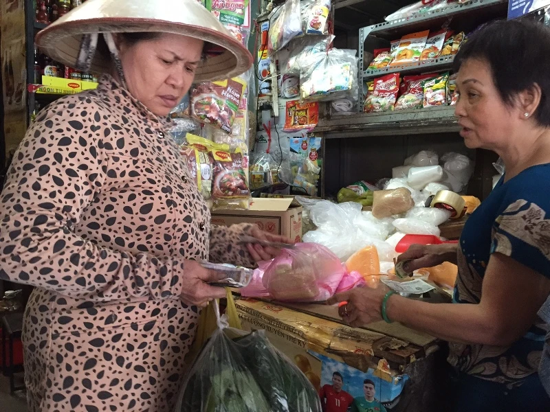 Bà Hùng (tiểu thương chợ Tân Sơn Nhất) đang bán đường, bột ngọt cho khách sáng 2-9.