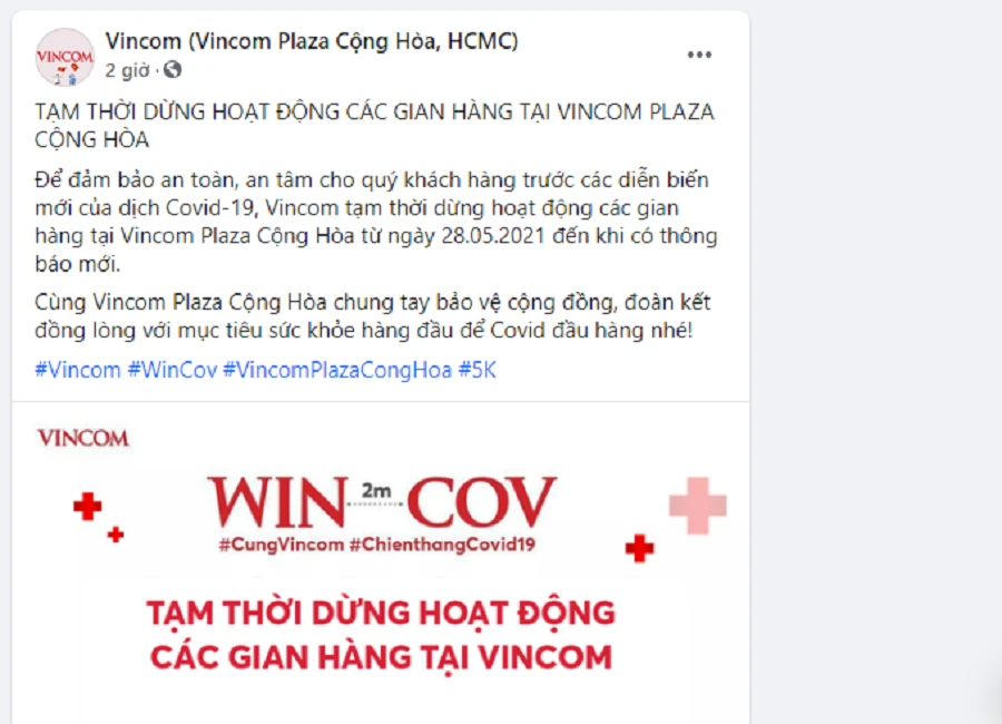 Mới đây, Trung tâm thương mại Vincom cũng thông báo để đảm bảo an toàn, an tâm cho quý khách trước các diễn biến mới của dịch COVID-19, Vincom tạm thời dừng hoạt động các giang hàng tại Vincom Plaza Cộng Hòa từ ngày 28-5 đến khi có thông báo mới.